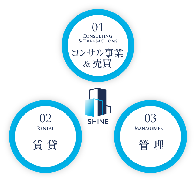 01 コンサル事業&売買 土地をどう活かすか、どんなアパートを建てればよいか。オーナー様それぞれの想いや状況に合わせて、最適なプランをご提案します。土地探しから購入、建築プランや資金計画までワンストップでサポート。さらにシャイン不動SUNでは自社でアパートを建築し、収益物件として販売する事業も行っています。企画から販売まで責任をもって手掛けているため、安心してご購入いただけます。もちろん、既存アパート・土地・建物・マンション等の売却や購入の仲介にも対応し、幅広いニーズに誠実にお応えします。 02 賃 貸 オーナー様にとって大切なのは「安定した入居」、そして入居者様にとって大切なのは「住みやすさ」です。私たちは地域のニーズや市場動向を踏まえた募集方法を工夫し、物件の魅力をしっかりとお伝えします。入居者様には、お部屋探しからご案内、契約までを丁寧にサポートし、安心して新生活をスタートしていただけるよう努めています。また、オーナー様にとっても安心して任せられるパートナーであるために、誠実かつ迅速な対応を心がけております。双方に喜ばれる信頼の賃貸サービスを提供し続けています。 03 管 理 シャイン不動SUNでは、入居後の管理を「安心を支える大切な役割」と考え、オーナー様・入居者様双方にご満足いただけるサービスを心がけています。家賃管理をはじめ、建物の定期点検や清掃、入居者様からのご相談やトラブルへの対応まで、迅速かつ丁寧にサポートいたします。日々の暮らしを支える安心感と、資産価値を守る経営サポートを両立させ、オーナー様には「任せてよかった」と思っていただけるよう確かな管理体制を整え、入居者様には「ここに住んでよかった」と感じていただける快適な住環境の提供を行っています。